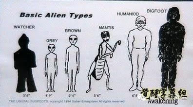 美国官方科学家于2008年,在第一次国际星际政治揭秘工程发表会上正式宣布,到1989年为止,美国官方正式记录在册并分类的就有57种外星人。而现在,有正式目击记载的已经有200多种外星人。 有许许多多智慧生命。 有人型的,类人型的,也有非人型的.有的生活在另外空间,也有的生活在人这个物质空间的另外星球上.今天的现代人把光临地球的智能生命统称为“外星人”.其实它们中有的在最早期人类文明之前就到地球了,是地球上的原住民. 1. UMMITES(宇莫星人),来自Volf 424 Ummo星,距地球有14多光年远,于1950年来到地球法国南方山丘地区。宇莫行人跟我们地球人长相很相像,同属于人型外星人,一样有男性女性之分。他们的逻辑系统跟我们不一样,我们的逻辑系统是真,假,他们的则是:真,假,是真是假,不是真不是假。 宇莫星人的文字 2. Pleiadeans ,也就是我们经常听到的昂宿星人,又称七姐妹星人,他们不论精神方面及科技方面都要比我们地球人高很多。跟我们地球人一样,他们也属于人型外星人,也有男女之分。他们的寿命比我们人类要长,据说可以活到一千年(这里是换成我们地球的时间)。他们住在Taygeta(泰莱塔恒星)的Erra(依柔行星)星,他们和我们一样拥有相同的祖先----天琴星人。 跟昂宿星接触最多的是瑞士独臂农夫Billy Meier,他先后与昂宿星人Sfath(1942-1953年) 他们谈话内容很广,人类的来源,太阳系的成员,还有宗教,(昂宿星人他们没有宗教,宇宙中没有我们所信仰的神存在,我们所信仰的神耶和华是另外一种外星人),核能,地球人口过多等。 昂宿星距离地球440光年,器重最明亮的九颗星在七姐妹的希腊神话中都有名称:斯泰罗佩(Sterope),梅罗佩(Merope),伊莱克特拉(Electra),玛亚(Maia),泰莱塔(Taygeat),塞拉伊诺(Celaeno)和雅克安娜(Alcyone),还有他们的父亲擎天神阿特拉斯(Atlas)和母亲普勒俄涅(Pleione)。 3.LYRAN(天琴星人),据说地球人及其他人型外星人的起源就是天琴星人。地球上的白种人高大,皮肤,头发,眼睛的颜色都很淡跟天琴星人很像。当天琴星发生战争时,许多人躲避战争移到昂宿星,毕宿星以及织女星上。约5万多年前天琴星又发生战争,当时的领袖及其他36万人来地球避难,成为天琴星人最早来到地球的时间点。 4,YEGAN(织女星人),他们于天琴星战后属于相当和平温和的人,他们现在居住于昂宿星,Volf 424 及其他地方,他们是战争后难民的后裔。 5.GREYS(小灰人),体型小,被新创造类似蜥蜴人的种族。身高3.5-4.5英尺(一英尺约合0.3米)。皮肤颜色有白色,灰色,白灰色,灰蓝色,灰绿色。无性别区分,没有生殖器。残忍没有同情心,他们是最常见的外星人种类。他们跟美国有秘密合作的关系,美国得到飞碟及其他武器的技术,GERYS得到资源&能源&复制GREYS的基地,在地球上,他们通过基地内的实验室培育其他的GREYS。 他们有3大类,他们来自距地球39光年的外猎户座Zeta Reticulan星系附近。 TYPE A:这是最常见的一个类型,他们来自伯纳星(猎户座邻近的Zeta Reticulan星系) 他们社会结构很严谨像是个军事单位机构,他们头大,眼睛大,简单消化系统,没有头发,没有生殖器,正常身高约4.5英尺。他们似乎是无情残忍的,这些GREYS服务于爬虫类外星人,他们在新墨西哥和内华达州有基地,于其他国家也有。他们的星球一天90个小时,一年432天。 TYPE B:来自猎户座的高GREYS(高的小灰人)。他们身高较高,有7-8英尺。他们有着大鼻子,他们比较会用政治影响力去达到某些谈判结果,他们在阿留申群岛有基地。 TYPE C:他们身高是三种GREYS中最矮的,约3.5英尺,他们面部特征和TPYE A相似,他们是最敌视人类的一种,他们来自猎户座的Bellatrax星. 6. GREENS or OLIYERIAN (绿人)。他们有着正常人类的大小,但却拥有橄榄绿色的皮肤。据说他们来自欧洲地下洞穴的地方。 7.MOTHMEN(天蛾人or 蛾人),他们生活在地下,有着像蝙蝠般的大翅膀,也拥有角。根据遇过他们的人描述,他们很聪明也很有恶意。天蛾人除了吓人之外似乎很少有做过什么坏事的传说。他们在西维吉尼亚州及新墨西哥州被遇见过。 8.NEFIILIM or NEFILIM(拿非利人),他们曾经在圣经旧约中出现过,也是属于堕落天使的一族。他们是天使和地球人类妇女所生的混血种族,他们属于巨人族,身高约7-10英尺。 9.CYGNUSIAN(天鹅星人),他们属于两栖类的人,有着大且凸起的眼睛,宽大的嘴巴,没有头发,黑又油亮的皮肤,可能有着潮湿的外表。他们也属于银河联邦的成员,他们距离我们地球约1550光年,他们于53000年前频繁拜访雷姆利亚大陆(一个已经在地球上消失的大陆文明). 10.ANDROMEDANS(仙女星系人),他们已经发展至没有形体的种族,年龄平均有2007岁,他们也是昂宿星人的领导人及人型外星人的最后演化目标。他们也是个古老的种族,他们很担心我们的未来。他们说我们于2012年12月开始从第3密度提升至第4密度,中间过程要持续2-3年左右。他们也正在帮助我们银河系人的成长,如同昂宿星人帮助我们地球人成长一样。 11.DRACO(天龙星人)他们是爬虫类外星人。属于“皇室统治阶层”。他们外观与其他外星人不同,天龙星人有翅膀,一般而言他们有7-12英尺高。而且他们层级制度是依照他们皮肤颜色来区分的,白色皮肤的天龙星人是最高级的。 据说天龙星人精通遗传学,且他们存在这个宇宙数十亿年了,他们也创造了数个种族,也因为这样他们天龙星人也想当这些“被造物”的神,面对这些种族,他们天龙星人有绝