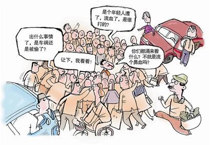 中国人大都是“看戏的不怕台高。”世上许多事,不论事好事坏,好像与自已没有多大关系,自已只管袖手旁观,像看戏一样。如果事情好了,自已自然要有一份,事情要是不好了,自已也只不过是个旁观者,与自已也没有多大关系。最奇葩的是,即使是坏事,大多数人不会避之则吉,而是既要摆出一副“事不关己高高挂起”的姿态,又要尽可能把坏事的全过程一睹为快。最近,广西柳州某吸毒女子全身裸露,欲从酒店楼上跳楼,引数百人围观拍照的事件,便是一个佐证。