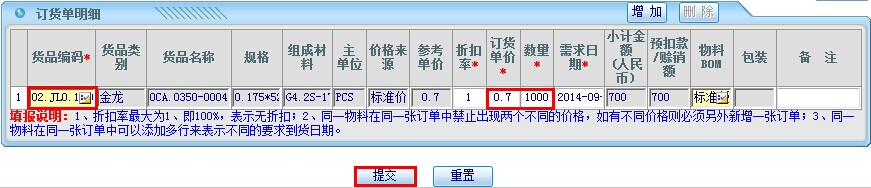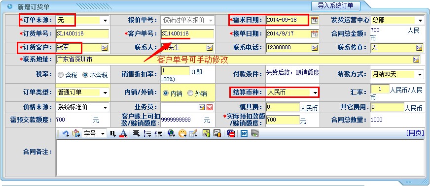 操作步骤:销售管理——销售订单管理——新增销售单;进入页面如下图操作: 表头必填(选)信息:订单来源(无);订货客户;需求日期;结算币种; 表位必填(选)信息:订货物料;订货单价;订货数量。 填写完成后点击提交即形成对应销售单据。