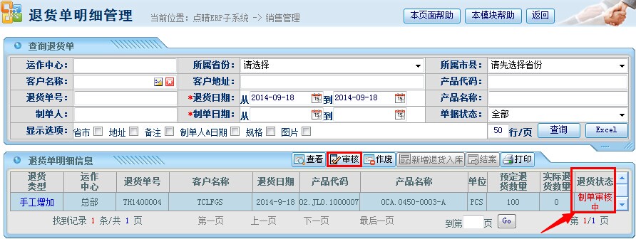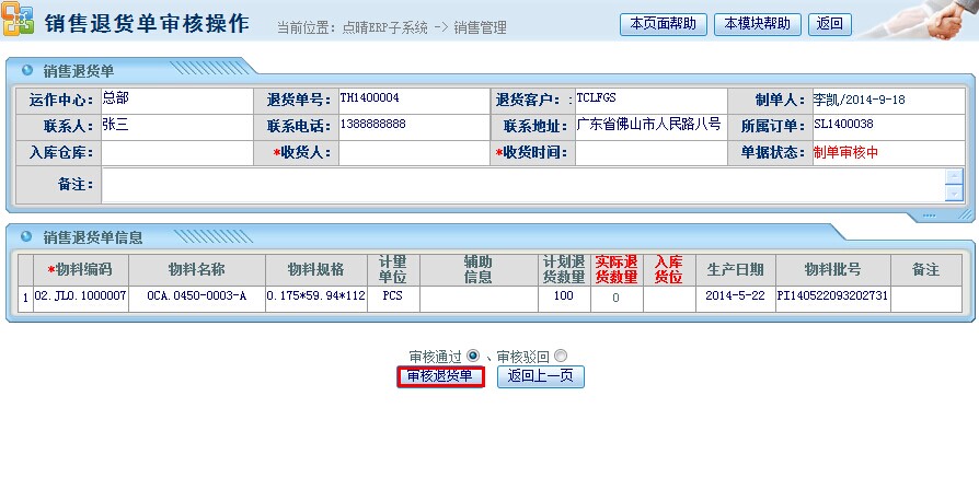 点晴模切ERP销售退货单管理流程—审核销售退货单