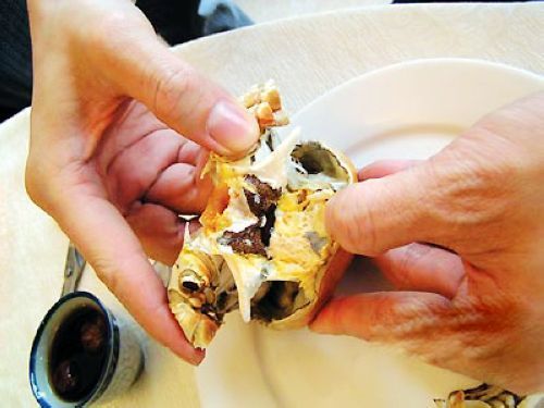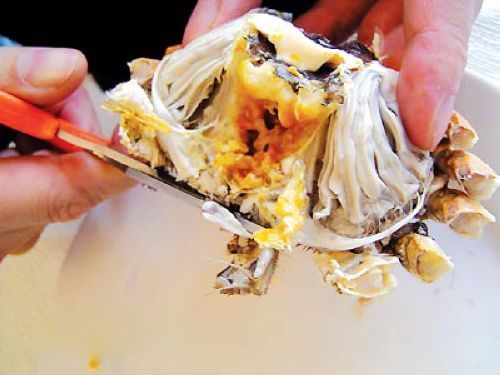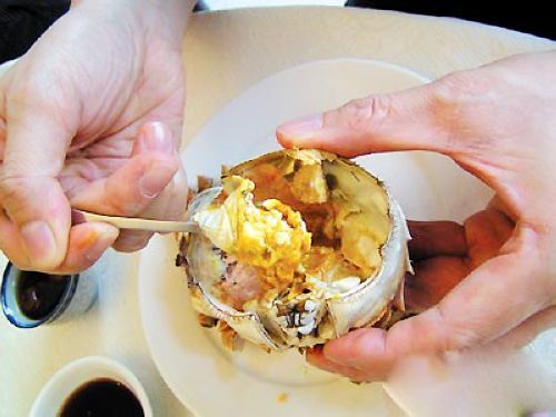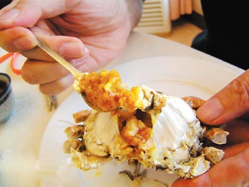 采访了那么多地方,大厨们都一致推荐先吃脚后吃黄的顺序。而很多经验老到的食客也都知道吃大闸蟹的最佳方法是先吃钳、爪,这时大闸蟹盖未揭,一位中餐厨师长告诉说:“吃过爪、钳后,再掀起大闸蟹盖,享用大闸蟹膏或黄,再吃大闸蟹肉,一点都不浪费,且这样不会走掉热气。”