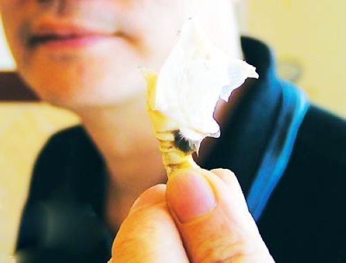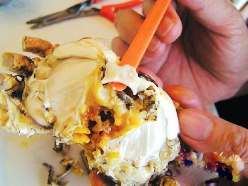 3、先吃蟹盖部分,用小勺把中间的蟹胃部分舀出,轻轻将外面包裹着的蟹黄吮干净。注意,不要吮破中间那个呈三角锥形的蟹胃,应将其丢弃;