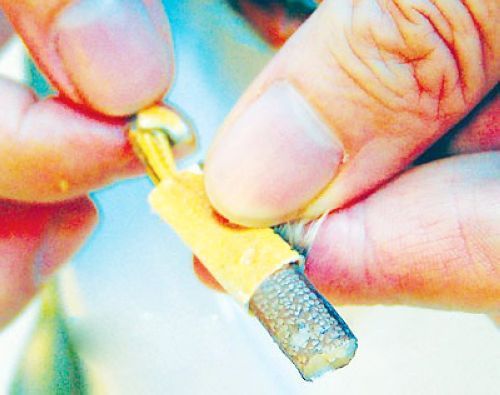 8、用剪刀把蟹腿剪成三截,最末一节蟹脚尖可充当工具。先用蟹脚尖细的那一头把蟹腿中段的肉捅出来,再用蟹脚尖粗的那一头把蟹腿前段的肉捅出来;