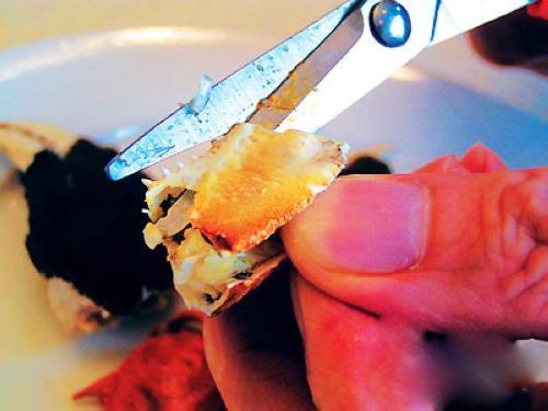 4、吃完蟹盖轮到蟹身,先用剪刀将多余的蟹脚、蟹嘴和蟹肺剪掉:
