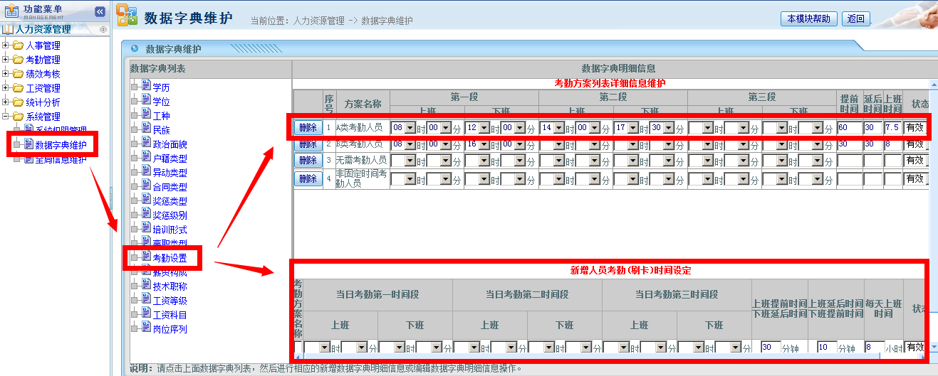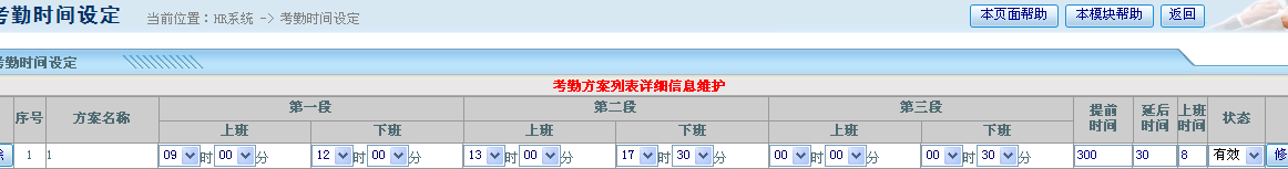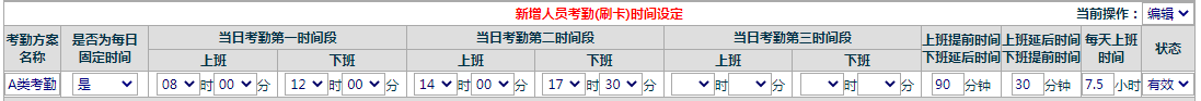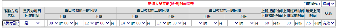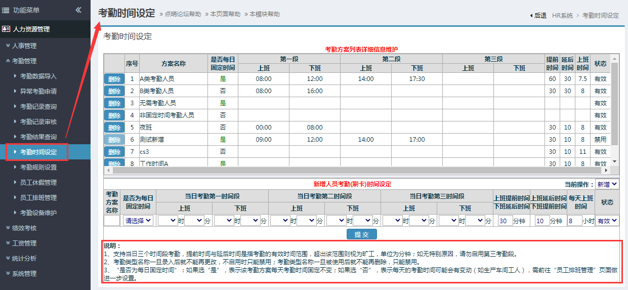 :1、注意上面的提前时间和延后时间,如果当日存在多个考勤时间段时,务必确保这些时间段在加上提前时间和延后时间后不发生冲突,否则系统将无法正确识别员工的出勤记录。 2、提前和延后的时间范围标识了打卡的有效时间范围,不在该时间范围的打卡记录将忽略掉,所以不要把提前和延后的时间都设置为0。 3、“是否为每日固定时间”:如果选“是”,表示该考勤方案每天考勤时间固定不变;如果选“否”,表示每天的考勤时间可能会有变动(即:弹性上班时间,如生产车间工人),需前往“员工排班管理”页面做进一步设置。 :员工绑定考勤方案二、“每日固定考勤时间”的员工绑定方法如下(如果启用人力资源管理中的人事信息维护,那么也可以在人事信息维护中绑定考勤类别和考勤卡号):