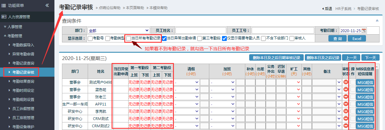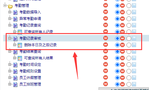 假如某个考勤方案设置为(此设置错误): 导入考勤时间格式和范围说明:1、导入的时间格式必须是24小时制!不能是12小时制,否则会全部都会被当成上午的时间处理!!! 2、导入的时间不允许跨越式导入,必须连续导入。所谓跨越式导入,即导入2016年3月15日的数据后,又继续导入之前时间例如2016年3月12日的数据;连续导入指导入了2016年3月15日的数据后,继续导入2016年3月16日的数据,中间时间连续不断。系统导数时会自动读取上次最后导入的时间,然后只取本次导入数据中在该时间之后的考勤记录! 3、另外,系统导入考勤数据的时候,不允许将不同员工的考勤记录拆开分别导入,必须一次性导入该时间段的所有员工的考勤记录。不同考勤机的考勤记录可以单独分别导入,但必须事先设定开启多考勤机导数功能,否则会按照以上规则将所有考勤机记录视为同一台考勤机的数据导入: ![]() 如果发生了错误的话,必须从错误日开始,将所有已导入的考勤记录全部删除,然后重新导入: ![]() 特别说明:建议采用点晴OA直接连接考勤机、自动从考勤机取数方案,不需要进行上面这些繁琐的过程,系统会自动实时判断需要读取的考勤数据! :审核考勤记录四、考勤数据进入到点晴MIS系统后,需要人事部考勤专员对导入的考勤数据进行审核确认,审核确认后的考勤记录才能被员工本人看到: 审核方法为逐个员工核实上面的考勤数据是否正常,符合系统设定规则的员工,系统会自动完成审核,对于有异常出勤,系统会显示为醒目的红色文字,提示考勤专员需重点关注,审核无误后,勾选操作列,即完成该员工的出勤审核,如果有异常的话,可以点击最后面的“MSG短信”提醒按钮,系统将会自动发送手机APP和微信短信提醒该员工对异常出勤补做异常出勤申请。 以上人事专员权限开放位置如下: