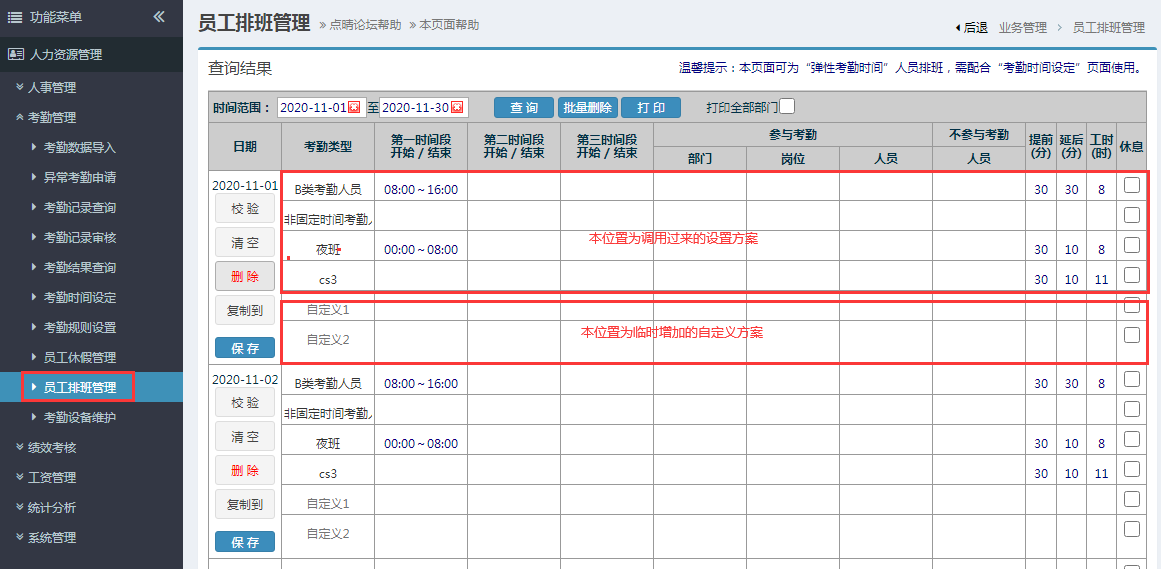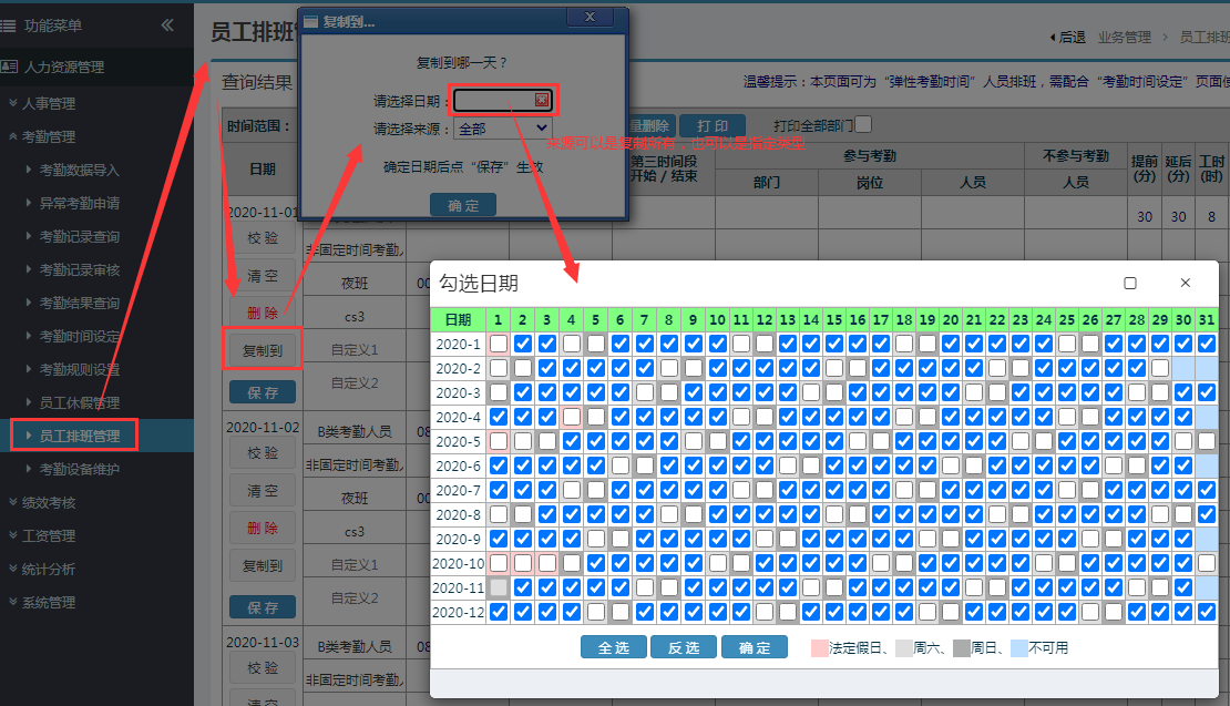 非固定考勤时间的员工(如生产车间工人)需前往“员工排班管理”页面绑定(看不到本菜单则说明未开权限,先开一下权限),在“部门、岗位、人员”列表中添加值后,点击“校验”再点“保存”: 使用复制操作最多可排一年的班: 排班后,员工可从“业务管理-考勤查询-查询我的排班”中查看自己的班次:
