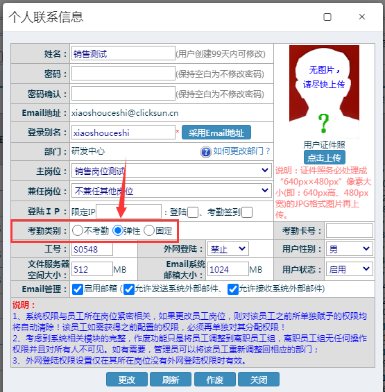 设置考勤卡号:就是考勤机中分配给此员工的考勤号,一般都是数字。注意这个考勤卡号不是员工的工号,切勿输入为员工工号。 设置考勤类别: 对于固定上下班时间的后勤人员,直接设置考勤类别为:固定,然后在后面挑选上面设置的考勤方案即可完成该员工的考勤数据绑定。 对于上下班时间动态变化的车间工人之类的岗位,需要将考勤类别设置为:弹性,然后再设置一年中每个月、每天的上班时间计划: