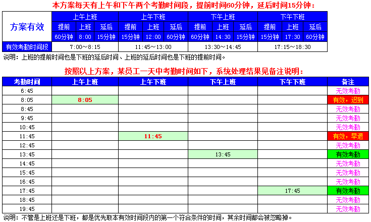:导入考勤记录三、导入考勤机考勤记录到点晴MIS系统中,点晴MIS系统考勤模块支持如下三种方式导入数据进行自动考勤记录和统计结果: 1、无考勤机的单位: 可直接使用点晴MIS系统中电脑考勤功能,用户在点晴MIS系统中考勤,系统自动采集用户的考勤数据:http://4582.oa22.cn 2、已有考勤机、但考勤机不支持网络连接直接取数到点晴MIS系统的单位: 人工将贵司现有考勤机数据导出到Excel中,处理成点晴MIS系统考勤模块要求的格式,然后人工导入到点晴MIS系统中:http://4506.oa22.cn 3、已有考勤机、并且考勤机支持网络连接直接取数的单位: 由于考勤机接口方案没有国家标准,不同考勤机厂家、甚至同一个厂家生产的考勤机数据格式都可能不同,如果考勤机支持TCP/IP网络取数、并且生产厂家提供了接口开发文档,可联系点晴公司QQ群在线客服1、2、3咨询个性化付费定制开发考勤机数据接口事宜,可实现自动将考勤机中的数据自动实时导入到点晴MIS系统中。 详情参见: 导入考勤时间说明:假如某个考勤方案设置为(此设置正确):