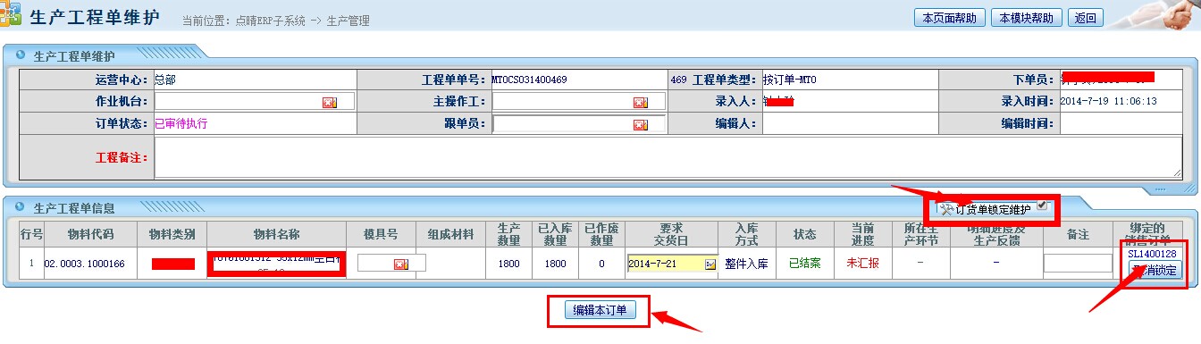 一张销售单上面存在多个物料,其中一部分按正常的排产入库发货结案,还剩下部分物料,由于客观的原因不再进行排产发货了。那么这张单如何进行结案呢? 以下图这种情况为例: 上图就是典型的例子,直接想结案,发现结案按钮是灰色的。 结案销售单,必须保证销售单所对应的所有生产工单都需要解锁,且没有正在进行的送货单。 解决方法: 1、找到这张单对应的生产工单,如下图所示; 2、点击查看按钮,对工单进行解锁操作; 3、返回到需要结案的销售单,这是结案按钮正常亮起,可以进行结案操作。 点晴模切ERP更多信息:http://moqie.clicksun.cn,联系电话:4001861886 该文章在 2016/2/15 10:07:35 编辑过 |