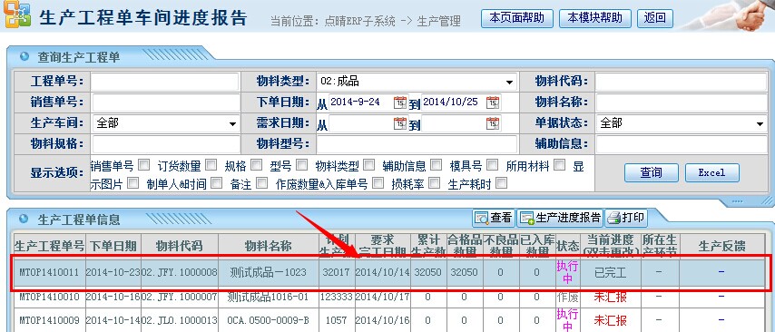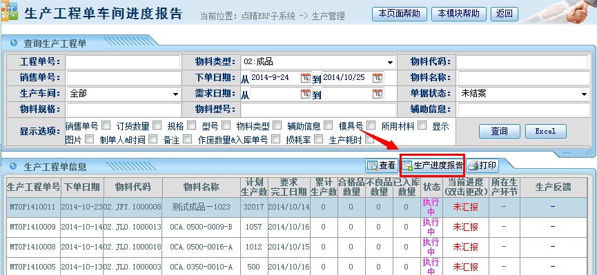 操作步骤:生产管理——生产进度汇报;进入页面如下图操作;