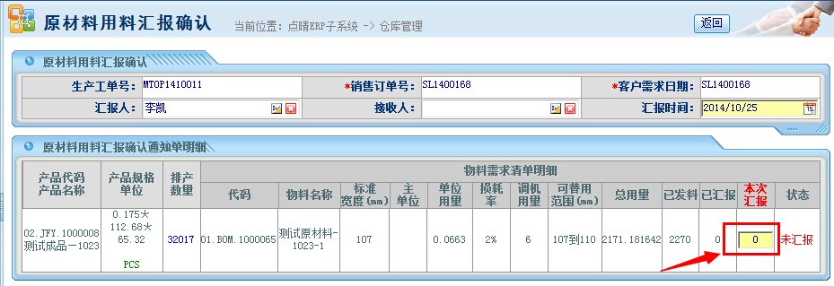操作步骤:生产管理——生产用料汇报;进入页面后如下图所示: