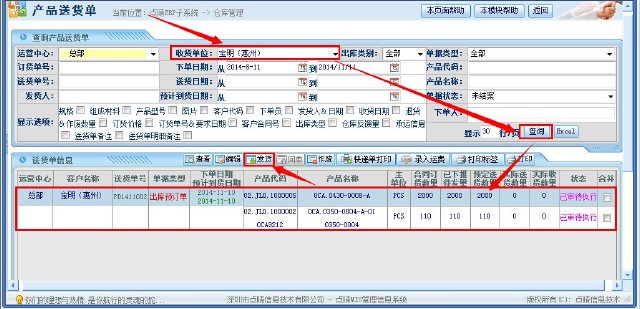 ![]() 进入页面后操作步骤:选择客户名称——点击查询——选中对应送货单——点击“发货”。