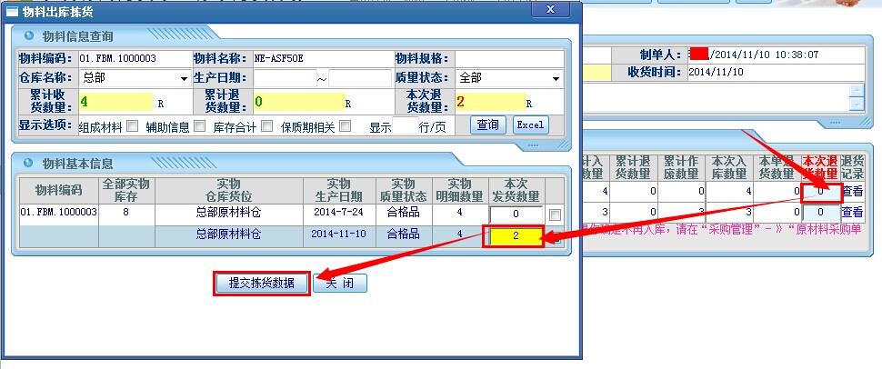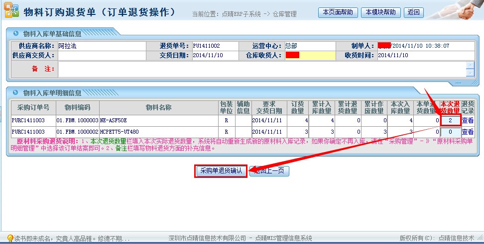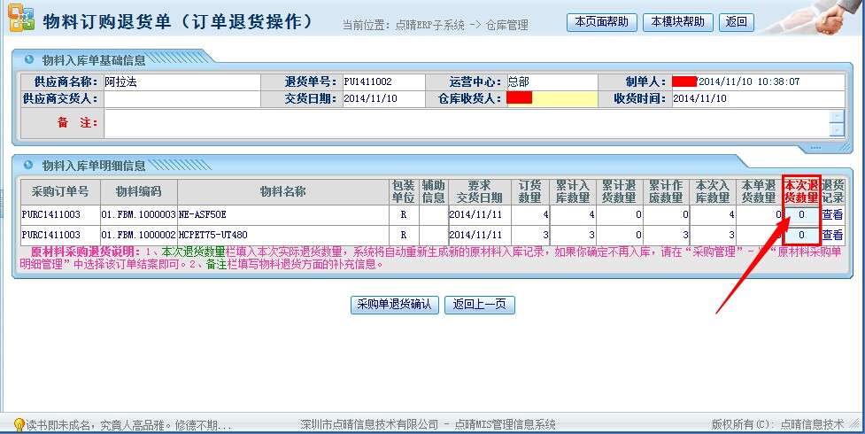 点选本次退货数量下面的方框,出现如下图所示页面: