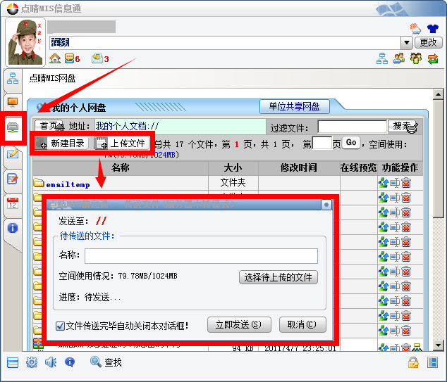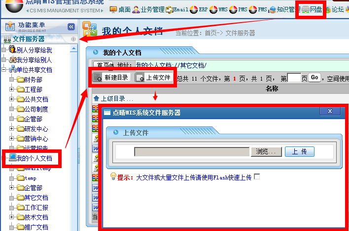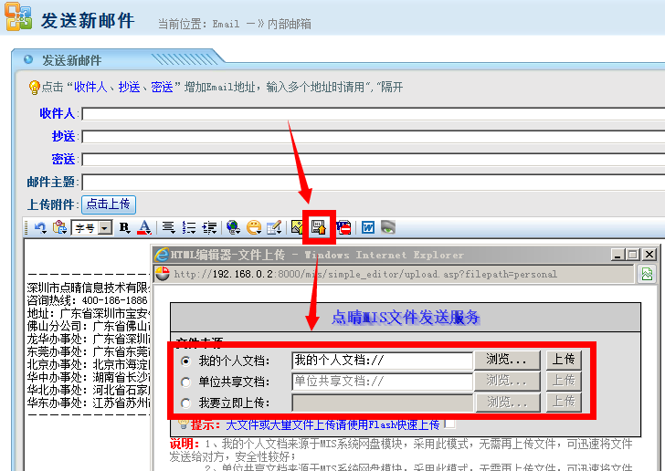 点晴OA中的Email模块也是采用这个方法来实现大附件的发送和分享的,当附件超过10MB时,用户应该先将附件上传到网盘中的个人文件夹,建议用户安装点晴MIS信息通PC客户端(介绍、下载)来上传文件、不受文件大小限制而且快速高效。以后发送Email时,就可以从网盘中挑选需要发送的文件放到Email中了。