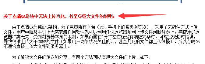 ![]() ![]() ![]() ![]() 重要说明: Email是一项很古老的互联网技术,最开始的EMail是以发送文本文字的用途,后来虽然经过不断改进,能够支持附件的发送,但其基本原理还是将附件编码为文本来发送给对方、对方收到后再按照相应的编码反编译出附件,由于这种技术效率十分低下,对服务器的资源耗用十分厉害,所以一般的邮局服务商都不允许Email中的附件大于10MB,一般都建议将Email的附件控制在5MB以内,也就是说:Email不适合用于大文件分享! 错 误 号:-2147467259 错误描述:007~ASP 0104~不允许操作~ 错误来源:Request 对象 原因分析:Windows Server服务器上的IIS为了安全性考虑,默认不允许上传大于200KB的数据到服务器。本来点晴OA安装程序安装时会自动对IIS这个参数进行扩容处理(点晴OA一键安装包或半自动安装程序都会自动执行这个操作),默认会扩大到最大允许上传50MB的文件到服务器。但因为某些特殊原因,例如操作系统安全性过高、版本不匹配、杀毒软件拦截等,可能导致这个自动扩容操作失败,用户上传大于200KB的文件时,就会出现上述错误了。 为了解决Email大附件分享问题,各邮局服务商也是各显神通,用了很多办法来解决大附件的分享问题。一般常用的方法是在EMail中创建一个网盘目录,先将大附件上传到这个网盘中,要发Email时,再临时调用这个附件的链接到Email中即可,这样的处理方法可以彻底的简化大附件文件的发送,Email本身不将附件编码进去,整个Email只有简单的文本,所以发送速度十分快速,对方收到Email因为不需要解码附件,直接打来下载链接即可下载附件,也十分的方便。