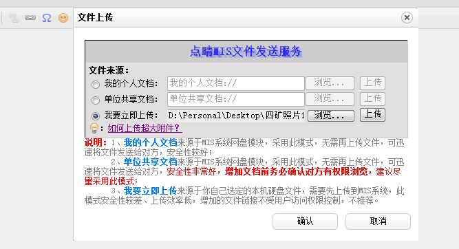 在点晴OA中用WEB方式直接上传附件(10MB以内的附件可以用本方式): ![]() 在点晴MIS信息通PC客户端中上传附件(10MB以上的附件建议用本方式,点晴MIS信息通介绍:http://im.clicksun.cn):