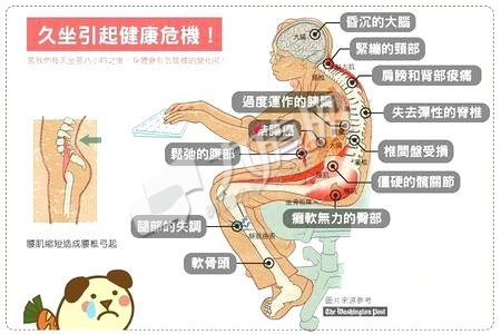 当你站立、移动甚至是坐挺,腹部肌肉会让你保持直挺。但当你塌在椅子上,他们就不被使用了。紧绷的背部肌肉及无力的腹部,使得脊椎原有的曲线被加倍放大了。