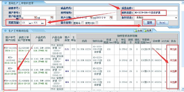 答:在原材料领料界面,操作步骤:仓管管理——物料出库管理——生产领料出库——新增领料出库单;进入页面后,输入对应的物料名称;如:“HG-322U-006-PU胶保护膜”,在宽度范围里面输入对应宽度范围;如“131”——具体如下图所示: 找到对应单据发料即可。