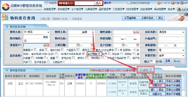 操作步骤:1.勾选库存明细;2.勾选维护;3.点击调整状态