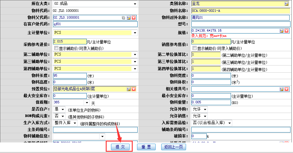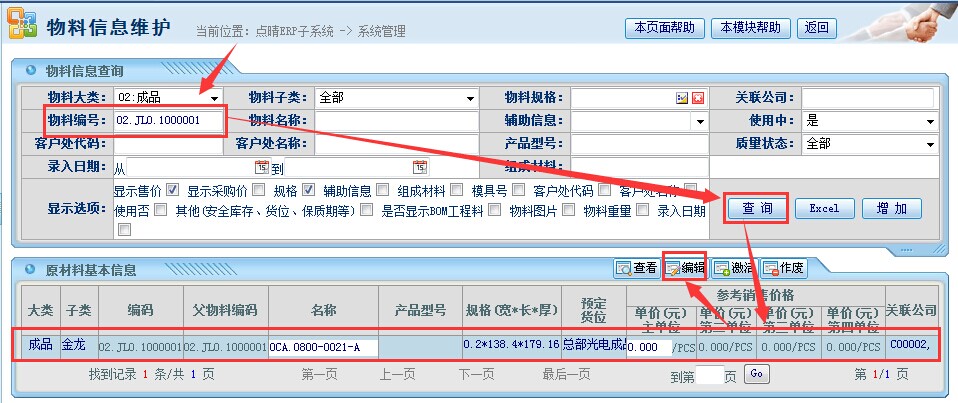 操作步骤:输入对应的物料编号进行查询;选择物料信息;点击“编辑”
