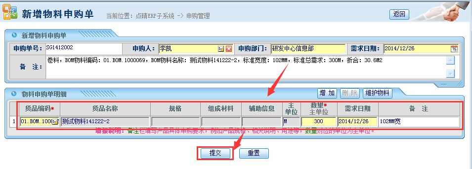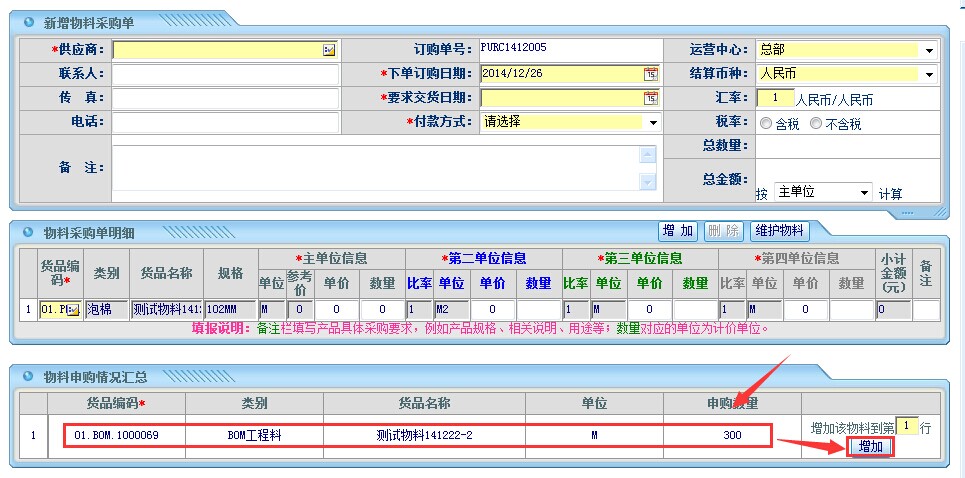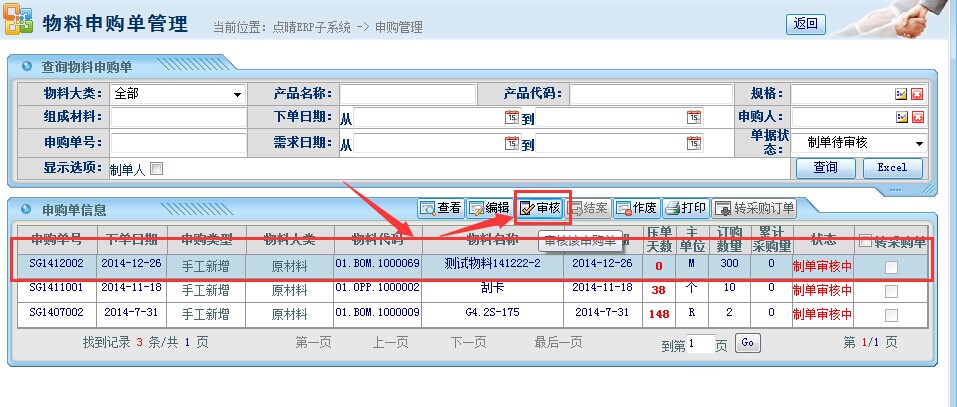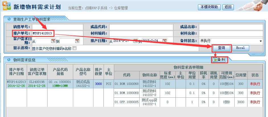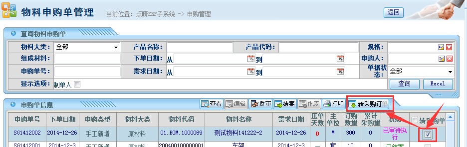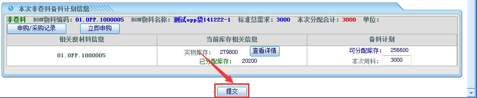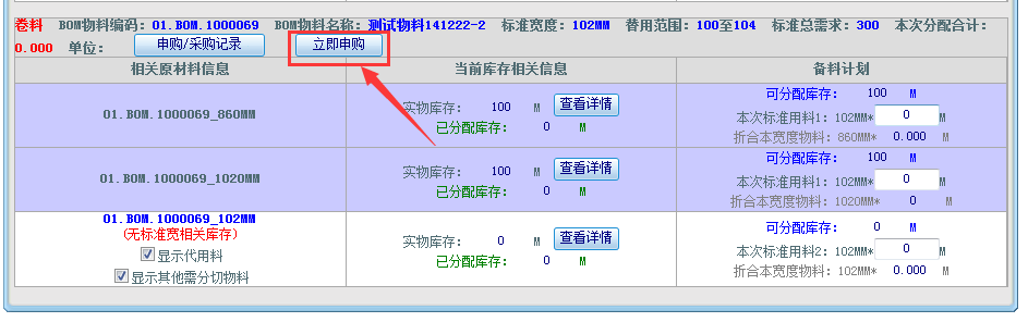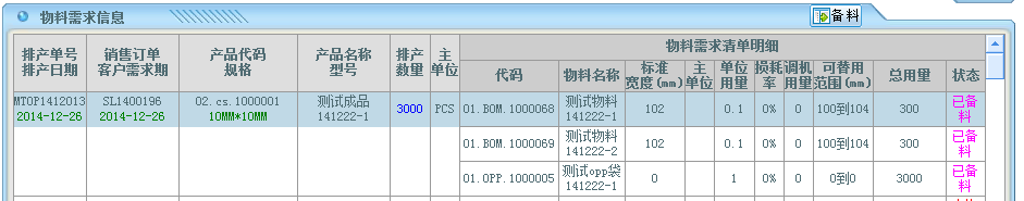 操作步骤:生产管理——排产管理——新增物料需求计划;进入页面如下图操作: 进入页面,按照排产单号进行查询,选中需要做备料计划的单据,点击“备料”按钮,进入如下图所示页面: 进入此页面,能看到详细的物料需求以及该物料其他的规格库存情况。根据标准需求填写数值(上图显示标准用料102MM需求300M,最后折合现有库存840MM宽,63.571M,库存现有数值为100M,满足生产需求)。 按照此分析方式,填写其他相应物料,点击提交即可;如下图所示: 提交后显示备料的信息,如下图所示: 备料完成。 若在分配图中,发现物料不足单据生产需求,则需要备料;如下图所示: 点击“立即申购”,转到申购单页面;如下图所示: 该页面自动带出所需标准物料的用量,按照需求填写申购物料类别(BOM工程料),点击“提交”即可。之后转到申购单审核页面;如下图所示: 选择申购单,点击“审核”即可。审核完成后,如下图所示: 进入此页面,直接点击“转采购订单” 点击后进入采购单下单页面,如下图所示: 点击“增加”,出现对应物料的所有规格的物料信息;可供下采购单人员任意选择。 添加到采购明细即可;如下图所示: 填写采购信息即可提交,则生产对应的采购单。 点晴模切ERP更多信息:http://moqie.clicksun.cn,联系电话:4001861886 该文章在 2014/12/26 14:54:02 编辑过 |