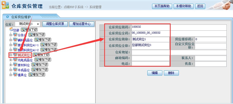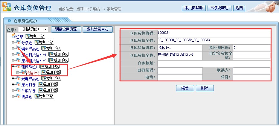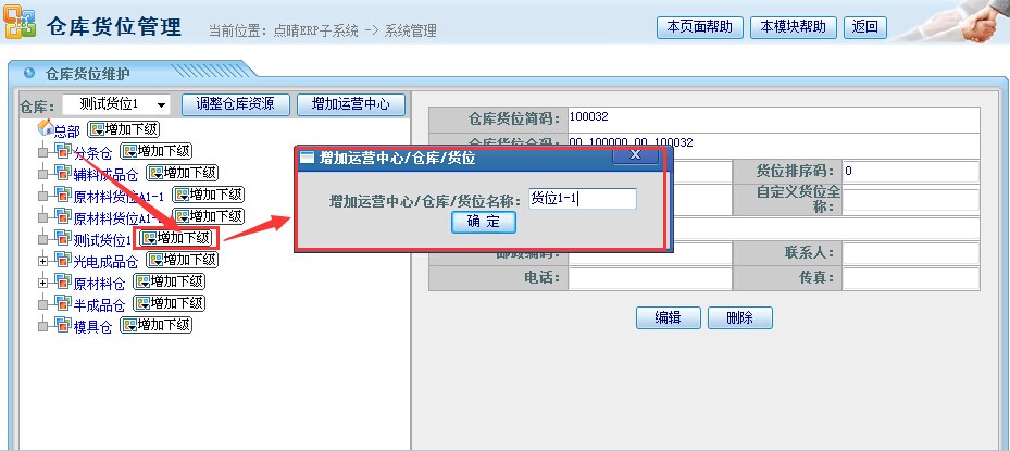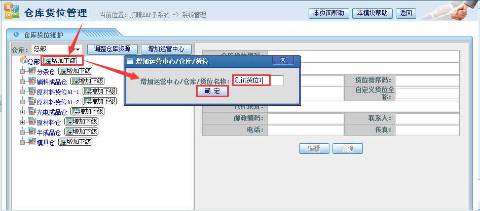 进入页面如下图所示: 点击“增加下级”填入货位名称点击“确定”即可。如下图所示:
