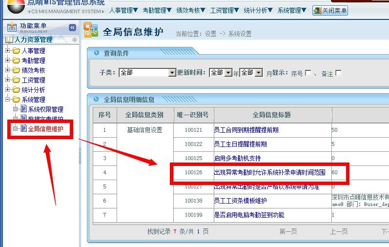进入业务管理-》人力资源管理模块-》全局信息维护(注意,不是系统全局变量维护中),找到“出现异常考勤时允许系统外补录申请时间范围”: