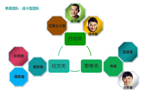 李晨队一般由李晨、陈赫、郑凯和外援明星等组成。且不论外援明星的角色,此团队的角色包括推进者、创新者和实干者,成员集中在行动类和思考类角色,角色的组合偏任务导向和结果达成型,踏实能干,擅长面对面的PK。