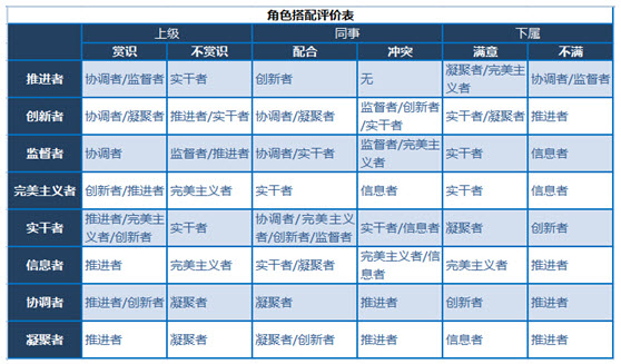 团队中的角色搭配是否合理,可以从角色数量、角色间的搭配程度、角色间的冲突等三个方面衡量。好的团队尽可能有完整的角色数量和较少的角色冲突,可以借助角色搭配评价表来评价团队角色间的冲突。