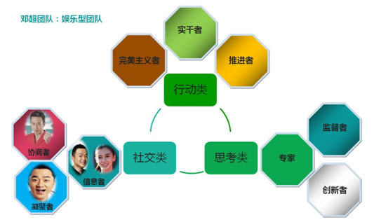 邓超——协调者,作为队长、团队的领袖,退后一步能看到更广泛的景象。他自信、成熟和稳定,认可团队成员的能力,擅长处理人际关系,与小鲜肉和老嘉宾都混得很熟,促进团队合作,只是有时判断力不够,被“奸臣”所骗的事情屡屡发生。