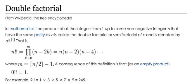 结果有多恐怖呢?复制到微信消息窗口中的时候,直接把微信程序搞到无响应了。粘在 Word 里,用同样的 12 号字体,单倍行距,足足占了 202 页。412291 个字,那是 40 多万位数呀,一篇顶过去五篇,一口气上五楼。 这时候也许会有朋友会大声疾呼说不对,更大的数字应该是“81105!!”,一个数阶乘的阶乘,那岂不是更大? 但是在数学领域里,两个叹号连一起是有名词解释的,这叫做“双阶乘”,来看维基百科里的解释。