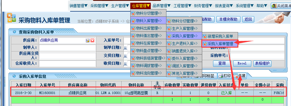 采购单已结案,如何进行驳回? 操作步骤:仓库管理——物料入库管理——采购入库管理——采购入库单管理;如下图所示: 选中对应的采购入库明细,点击“作废”按钮即可。 点晴模切ERP更多信息:http://moqie.clicksun.cn,联系电话:4001861886 该文章在 2016/3/30 17:17:01 编辑过 |