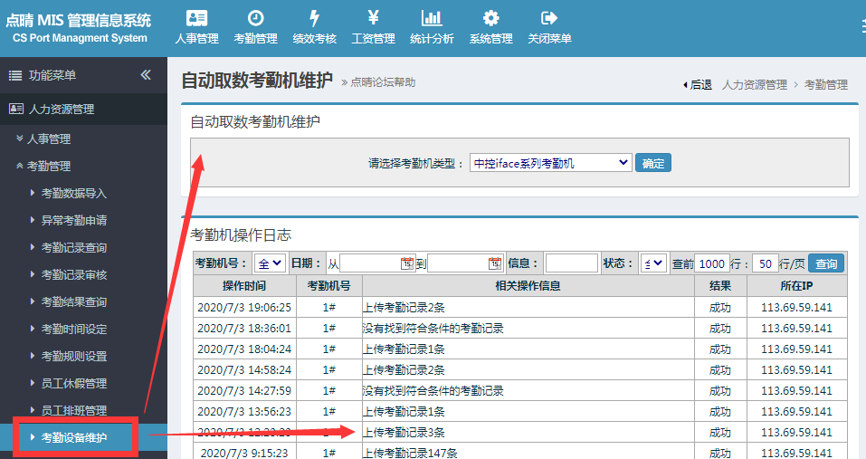 用户付费定制获得该功能注册码后,进入点晴OA业务管理-》人力资源管理-》考勤管理,点击“考勤设备维护”,就会看到以下提醒页面,在以下页面中会提醒使用单位联系点晴公司获取点晴OA自动获取考勤机记录的方法: