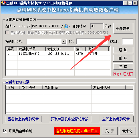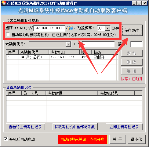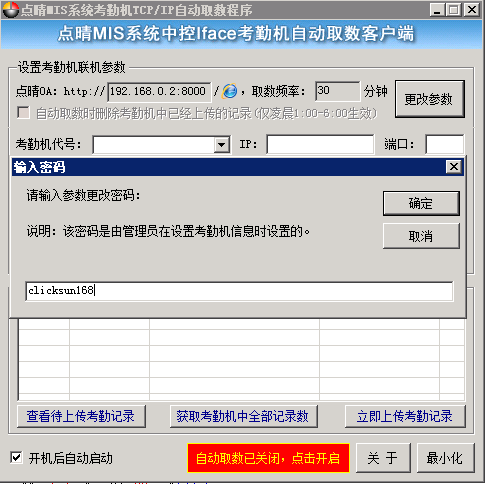 然后设置点晴OA的地址、取数频率间隔时间、是否在取数成功后删除考勤机记录等: