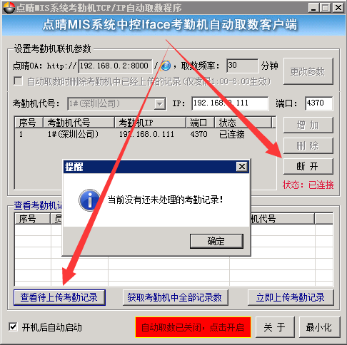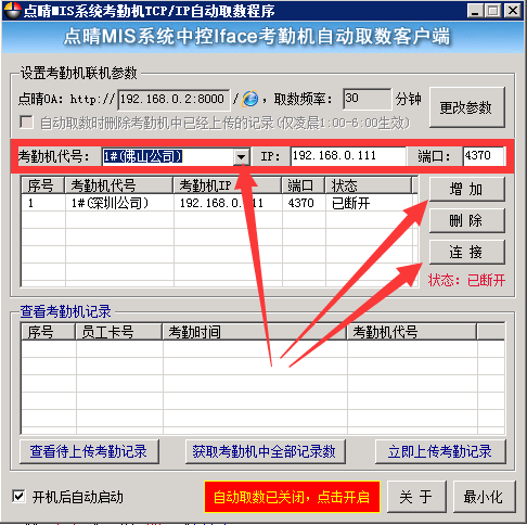 然后,安装配置客户端电脑上考勤机自动取数程序: 下载客户端自动取数程序安装在考勤机所在局域网内的一台电脑上,客户端程序下载: 安装教程:点晴MIS系统中控Iface考勤机自动取数客户端安装说明 下载以上程序,然后在考勤机所在局域网找一台白天会长期开机的电脑,将这个自动取数客户端程序安装在这台电脑上,一个局域网只需要找一台电脑安装一个这个程序即可,这个程序支持在同一个局域网内同时操作多台考勤机。不同的地点(例如有多个异地分公司时)才需要在每个地点安装一个这个程序 。 在普通用户PC上安装完毕后,打开这个程序进行必要的设置: