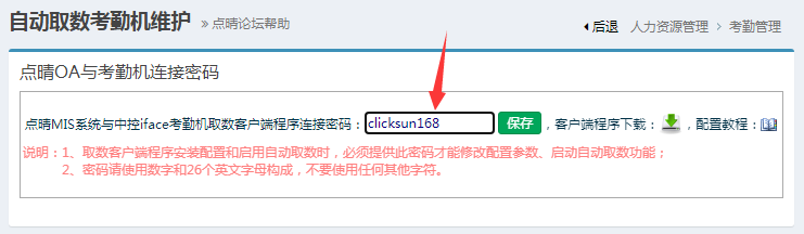 由于我国没有专门针对考勤机接口标准的国家标准,导致各个考勤机厂商的接口五花八门,甚至同一个考勤机生产商的不同产品,接口方法都不通用,所以只能针对不同的产品开发不同的接口程序。下面演示的是点晴OA与中控iface考勤机自动取数服务器端及客户端程序配置指南。 特别说明:本功能为付费定制开发功能,不免费提供,如有需要,请联系点晴在线客服: