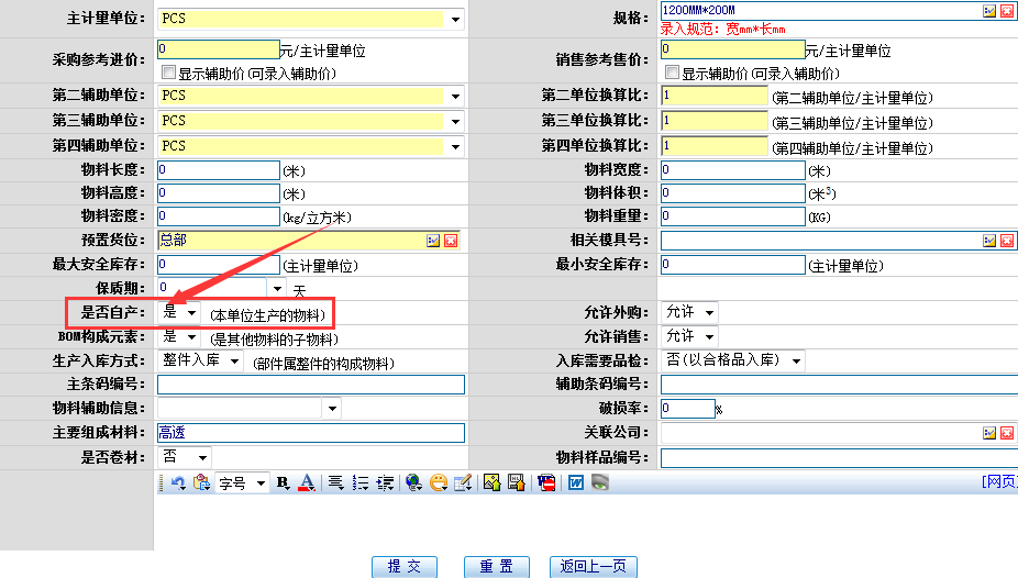 3、检查该成品信息是否为自产,只有自产属性的成品才会在BOM组成里显示