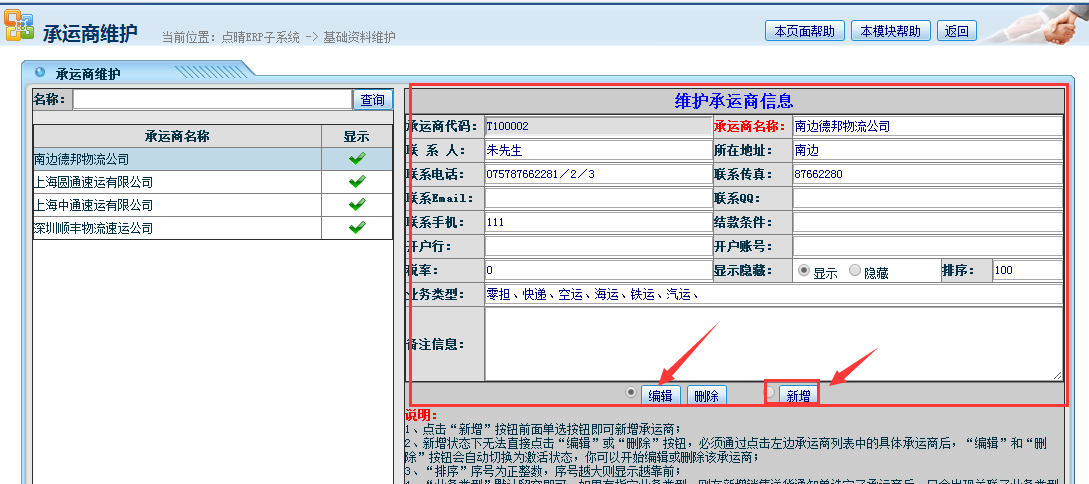 系统管理——仓库管理——承运商维护;如下图所示: